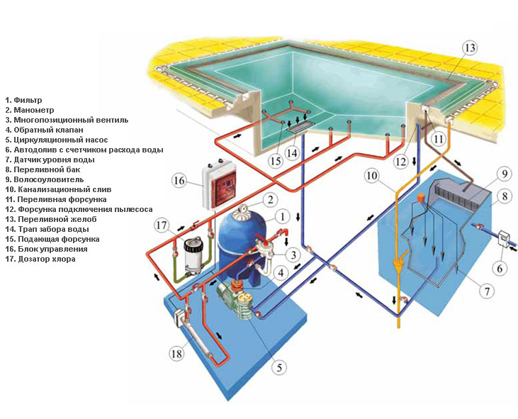 Переливная схема водоочистки несколько дороже по сравнению со скиммерной системой. Так как необходимо устройство переливных желобов, переливного бака, дополнительной автоматики.